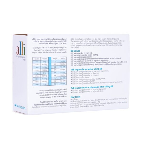 Alli slimming tablets are weight loss medicine which can help you lose weight by blocking the absorption of fat in your intestines. Alli is an over-the-counter weight loss medication in the UK, it contains the same active ingredient as the prescription medication Orlistat, at a lower dosage. You can buy Alli at Meds For Less , where we have overnight shipping most days of the week.